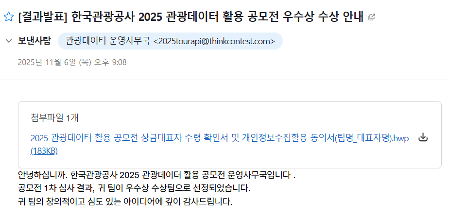 그리고 관광데이터 공모전에서 우수상이라는 결과를 받았다. 기분 좋은 11월이었다.